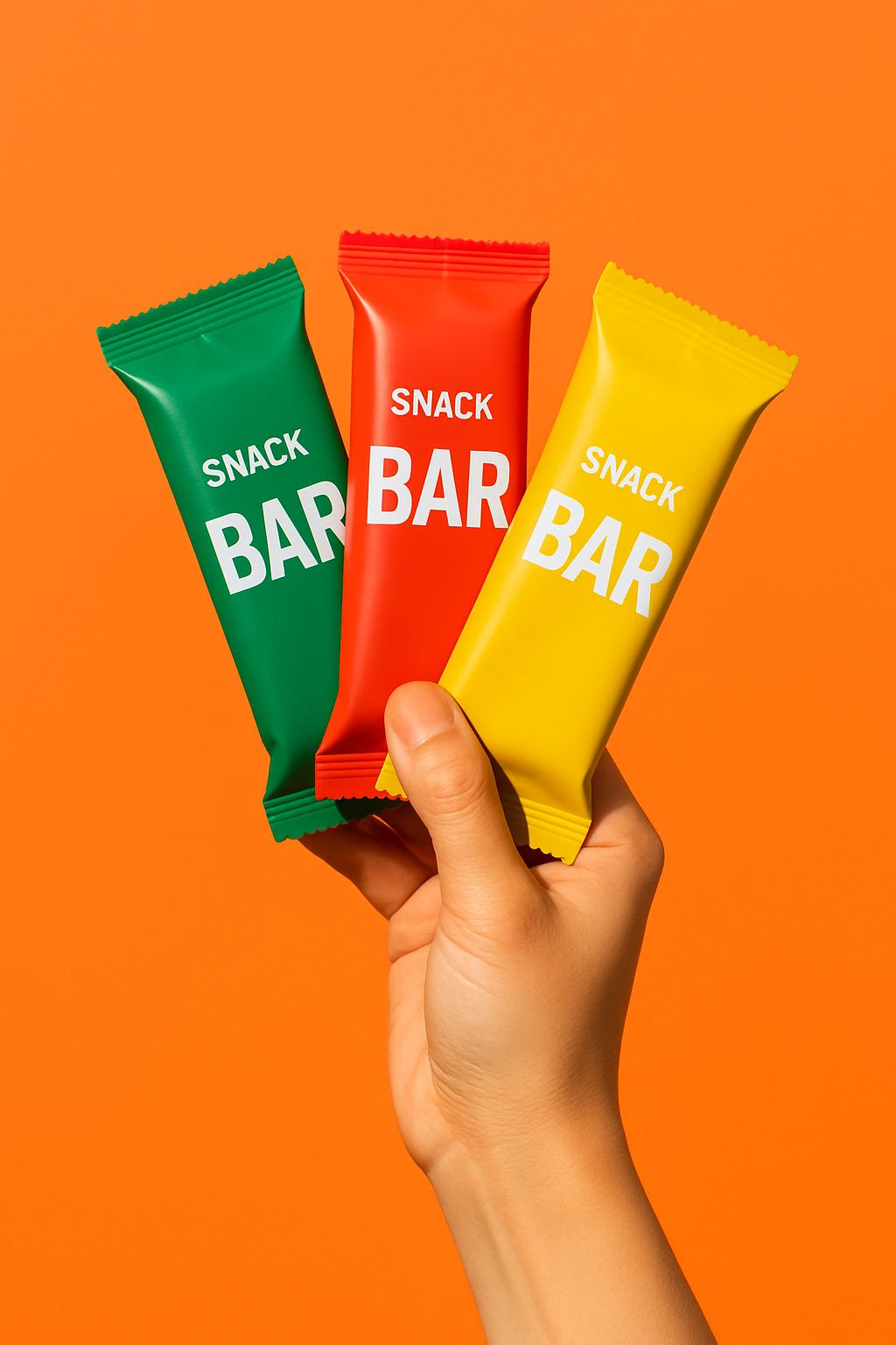 A minimal, bold studio shot of a hand holding three packaged snack bars against a solid, brightly colored background vivid orange or a bold pastel. The hand is positioned in the center of the frame, gripping the bars so that each package is clearly visible and angled outward. The product packaging should pop with vibrant colors and clean branding. Lighting is sharp, even, and slightly dramatic to enhance contrast, with no shadows on the background. The overall look is modern, playful, and eye-catching, emphasizing both the hand and the product without any distractions.
