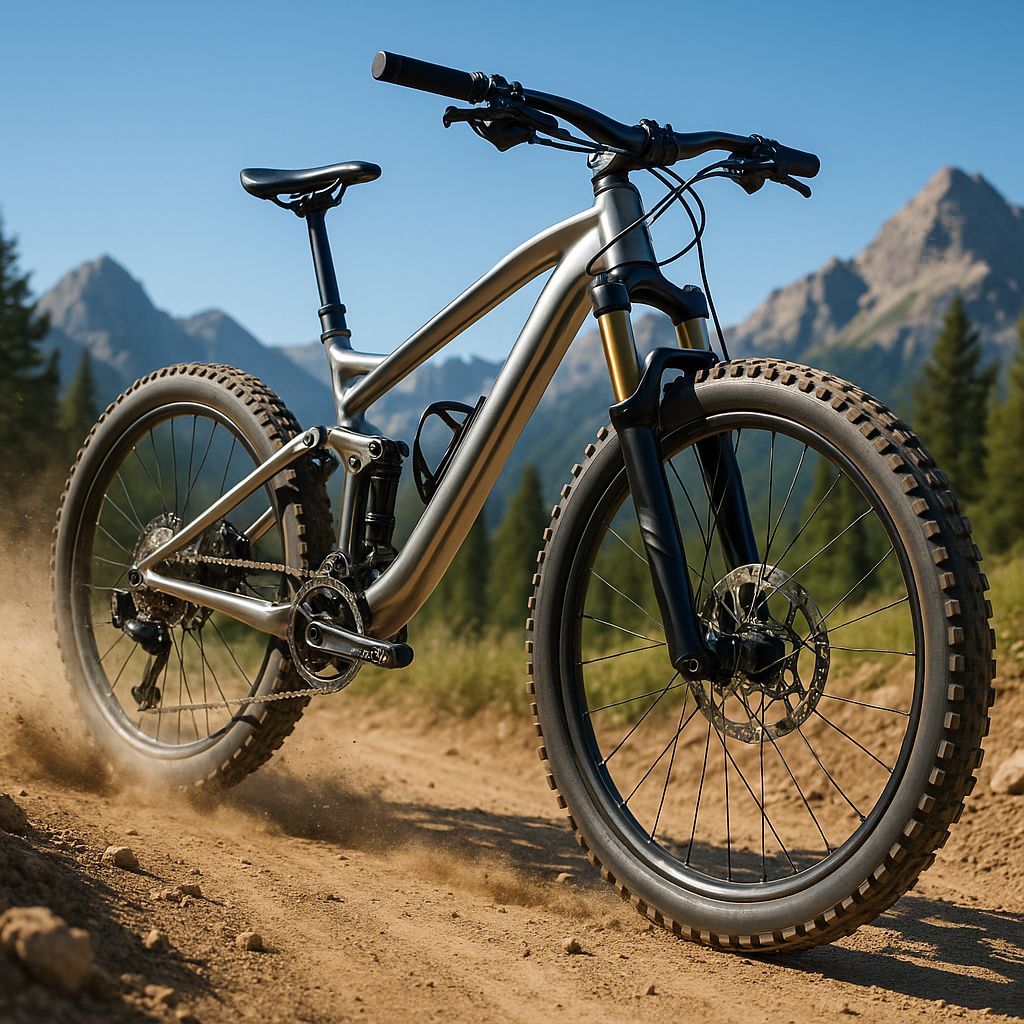 A high-performance mountain bike is captured mid-motion on a rugged mountain trail under clear blue skies. The sunlight glints off the metallic frame, highlighting every curve, detail, and precision-engineered component — from the thick tread tyres gripping the dirt path to the polished suspension absorbing the terrain. Dust kicks up behind the tyres, creating a dynamic sense of speed and power. In the background, majestic mountain peaks and green pine forests fade into a soft blur, keeping the focus entirely on the bike. The overall tone is bright, energetic, and aspirational — showcasing freedom, adventure, and cutting-edge engineering. Ultra-realistic lighting, shallow depth of field, 4K clarity, product photography style.