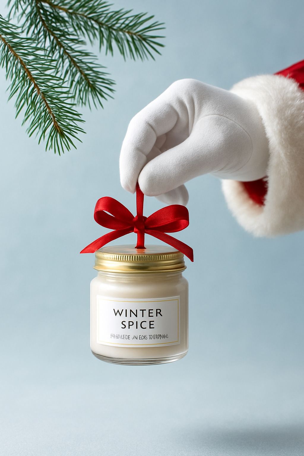 Premium Christmas-themed studio product shot with a soft icy-blue background. A 17 realistic pine tree branch extends from the top left corner. A white-gloved Santa hand, wearing a red velvet sleeve with white fur trim, gently holds a ribbon tied to a hanging product jar. Replace the jar with my product, keeping the same angle, size, and ribbon placement. Soft shadows on the background, bright winter lighting, clean festive aesthetic. Subtle holiday mood without clutter. Hyper-realistic details, crisp highlights, smooth skin on glove texture,