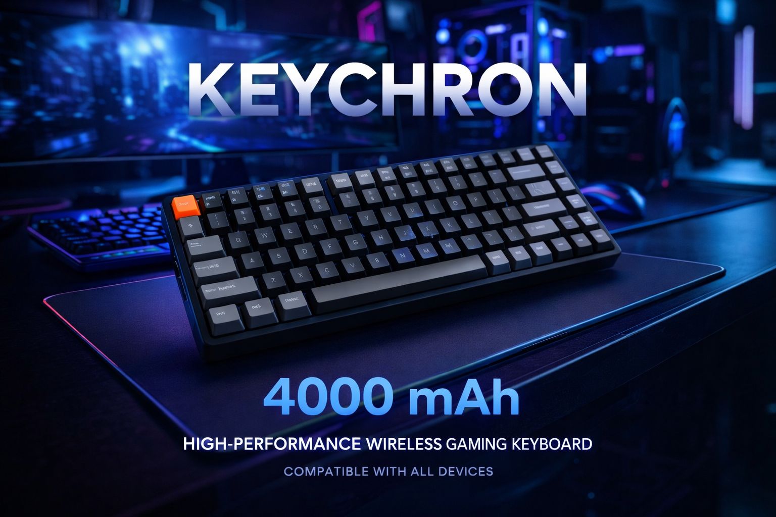 Ultra-realistic 8K commercial gaming advertisement featuring a premium wireless mechanical keyboard as the main focal point, angled slightly in perspective on a sleek desk surface. The keyboard should have dark grey and black keycaps with a distinctive contrasting accent key, sharp legends, visible mechanical switch depth, and realistic material textures. The background is a minimalistic, futuristic gaming setup with soft neon blue and purple lighting, blurred RGB PC components, and subtle reflections to create depth without distraction. Lighting is cinematic and controlled, highlighting the keyboard’s edges, key contours, and build quality with crisp highlights and soft shadows. A clean, high-end tech aesthetic with a modern sci-fi feel, designed to appeal to gamers, PC enthusiasts, and mechanical keyboard fans. Bold but minimal headline typography floats cleanly above or behind the product, with secondary feature text below (battery capacity, performance, compatibility), no clutter, no lifestyle elements, photorealistic, studio-grade, premium gaming brand look.