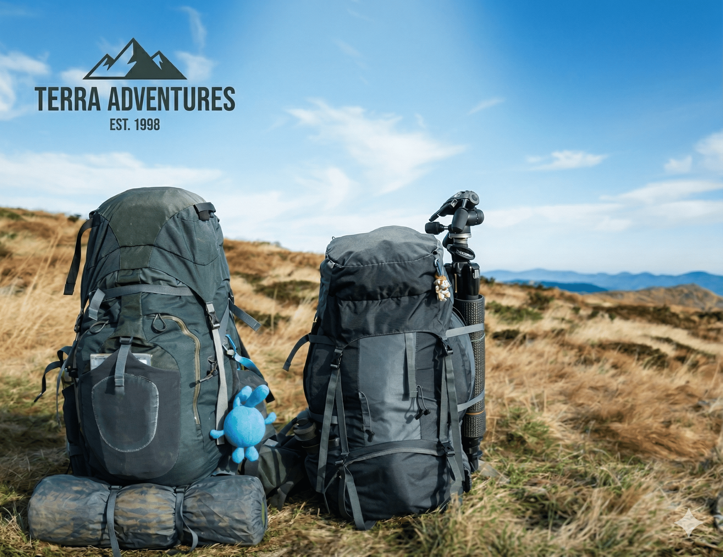 Hyper-realistic commercial photography of a professional outdoor gear setup. The focal point features two rugged, high-capacity technical hiking backpacks—one deep forest green and one slate grey—sitting side-by-side on a grassy mountain ridge. The backpacks are packed to capacity, showing intricate details of nylon textures, compression straps, buckles, and external gear like a rolled camouflage sleeping mat at the base and a professional camera tripod strapped to the side. A small blue plush toy is clipped to the green bag as a personal touch. The lighting is bright, natural daylight under a clear blue sky with wispy cirrus clouds. In the upper left corner, a minimalist professional logo for "TERRA ADVENTURES EST. 1998" is overlaid in clean, dark sans-serif typography. The background shows a vast, out-of-focus vista of rolling golden hills and distant blue mountain peaks, creating a sharp depth of field that keeps the focus entirely on the quality and durability of the bags.